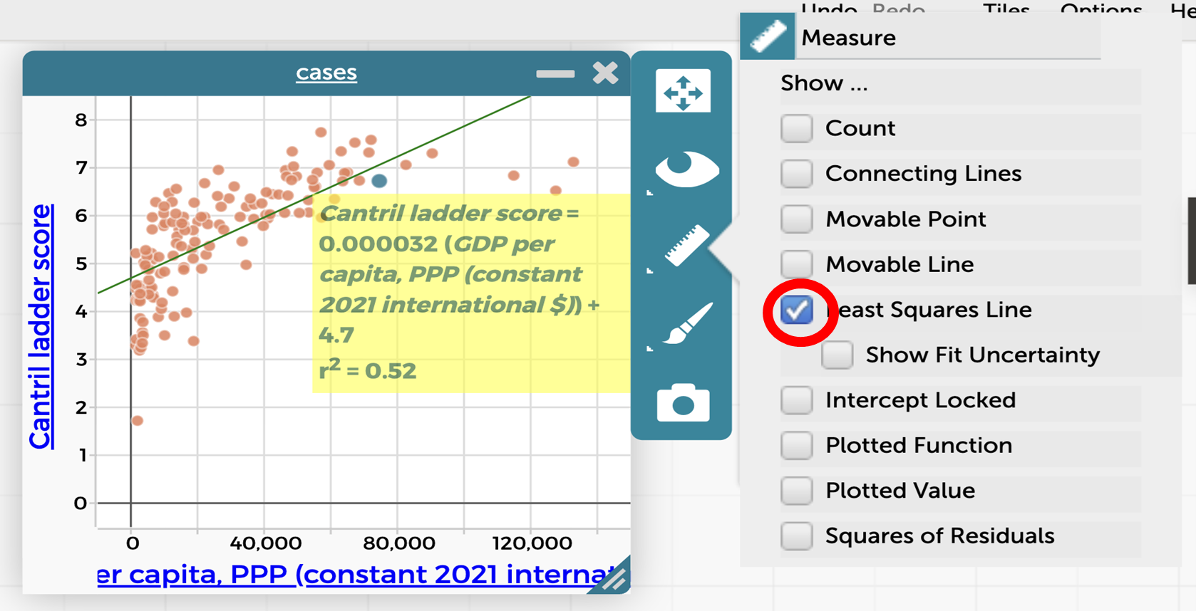 Ask students to open their CODAP file showing the 2023 GDP per capita (PPP) versus Cantril Ladder score scatterplot.
