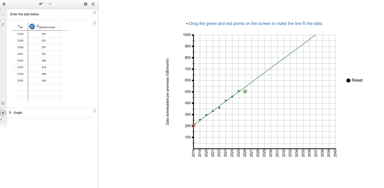 Demonstrate how to use the Desmos interactive Digital download trends to develop a linear model of the data downloaded per premises and obtain an improved prediction for: