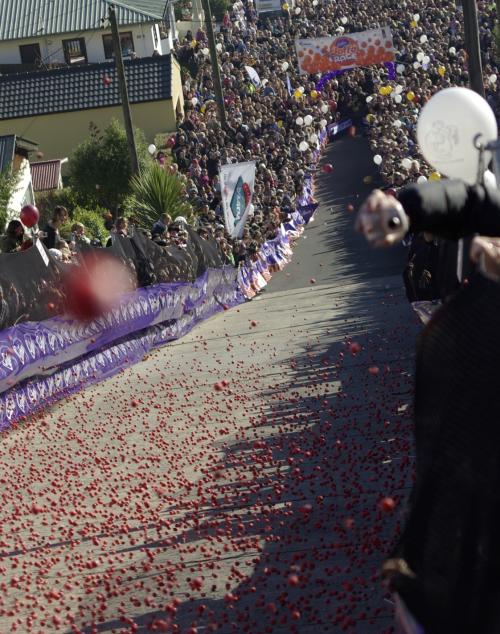 Baldwin Street in Dunedin, New Zealand is often described as one of the steepest residential streets in the world, with a gradient of about 35% at its steepest section and a total length of approximately 350 metres. Each year from 2002-2017 thousands of orange confectionery balls (‘Jaffas’) were released from the top of Baldwin Street and raced to the bottom as part of the Cadbury Jaffa Race. The video Jaffa Race 2015 captures one of these events.