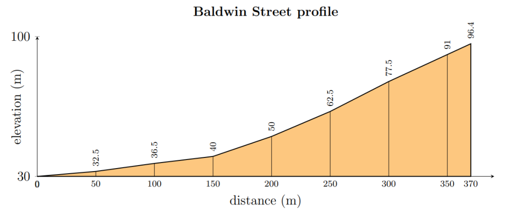 The side-on profile of Baldwin Street is shown as a series of straight-line segments. This is a modelling decision. In reality, the street is unlikely to change slope in perfectly straight sections. The straight segments approximate how the steepness varies along the road.