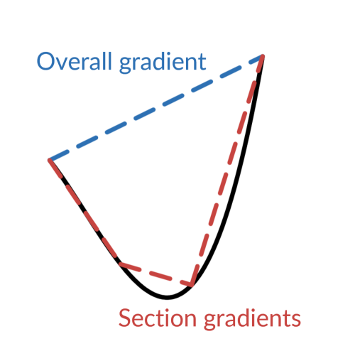 When students calculate a single value for their road sign, they may average several subsection gradients. This provides an opportunity to highlight an important idea: averaging individual subsection gradients does not necessarily produce the overall average gradient unless the subsections have equal horizontal length.