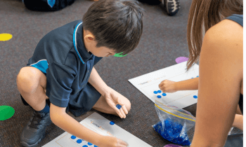 We designed this simple game to build students’ skills in using 10 as a benchmark number. Students name the number in their collection in relation to 10 and the winner is determined by the person closest to 20.