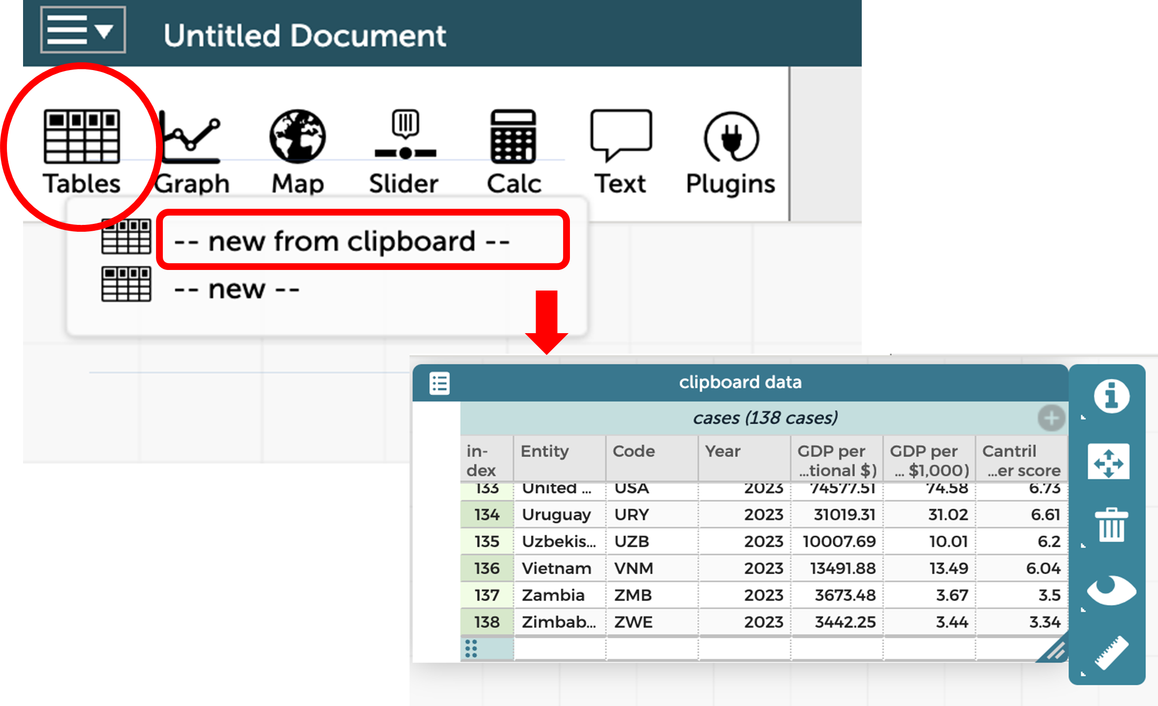 Click on the Tables icon in the top left and select “--new from clipboard--”.