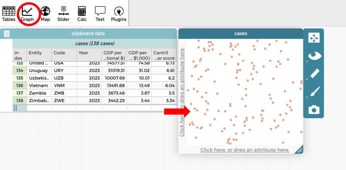 Click in the header cell of the fifth column “2023 GDP per capita (PPP)” and drag it onto the horizontal axis in the blank scatterplot.