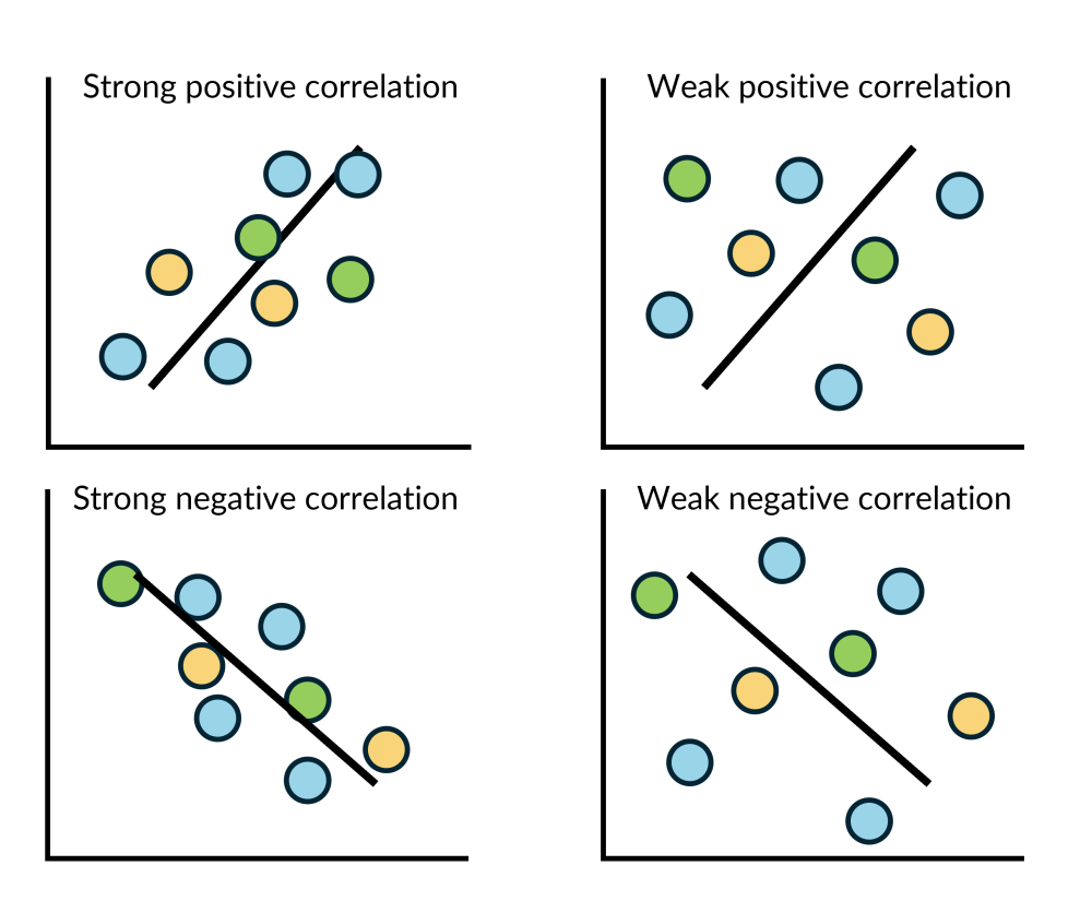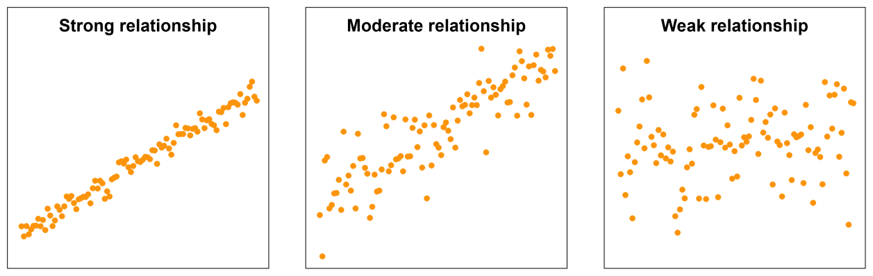 The strength of a correlation describes how closely the points follow a general pattern. Strength is often described as strong, moderate or weak, although these categories are not strictly defined. A strong correlation is indicated when points lie close to a straight line. A moderate correlation shows a clear overall direction, but with more spread around the line. A weak correlation appears as a scattered cloud of points, with only a vague sense of direction.