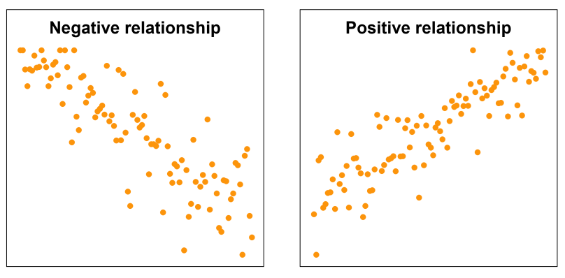 The direction of a relationship describes whether the variables tend to increase or decrease together. A positive correlation occurs when both variables increase or decrease together. For example, as a child’s age increases, their height also tends to increase. In a scatterplot, a positive linear correlation is indicated when the points roughly follow a line with a positive gradient, sloping upwards from left to right. A negative correlation occurs when one variable increases as the other decreases. For example, as time spent using a phone increases, the remaining battery life decreases. In a scatterplot, a negative linear correlation is shown by points that roughly follow a line with a negative gradient, sloping downwards from left to right.
