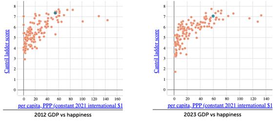Ask students to access the second sheet in What makes us happy? Spreadsheet, titled 2012 GDP per capita. Students copy this dataset into CODAP and create a scatterplot with the variable GDP per capita (PPP) on the horizontal axis and the Cantril Ladder score on the vertical axis. Students then compare the 2012 scatterplot with the scatterplot they created from the 2023 dataset.