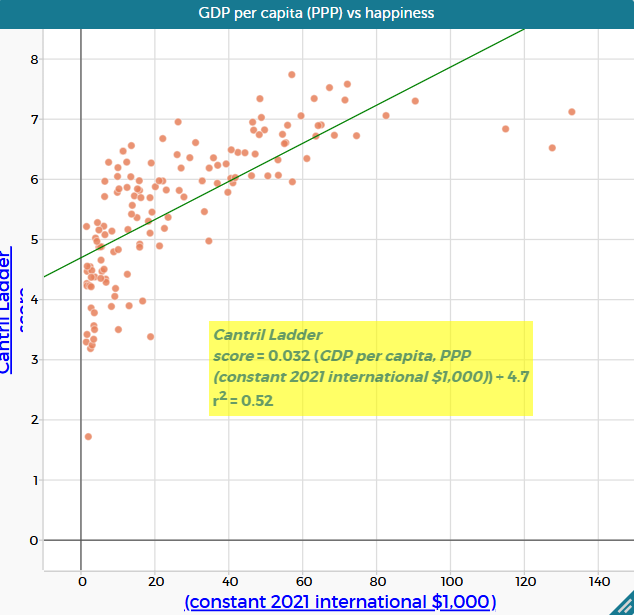 $$\text{Cantril Ladder score} = 0.032 \times \text{GDP per capita (PPP)} + 4.7$$