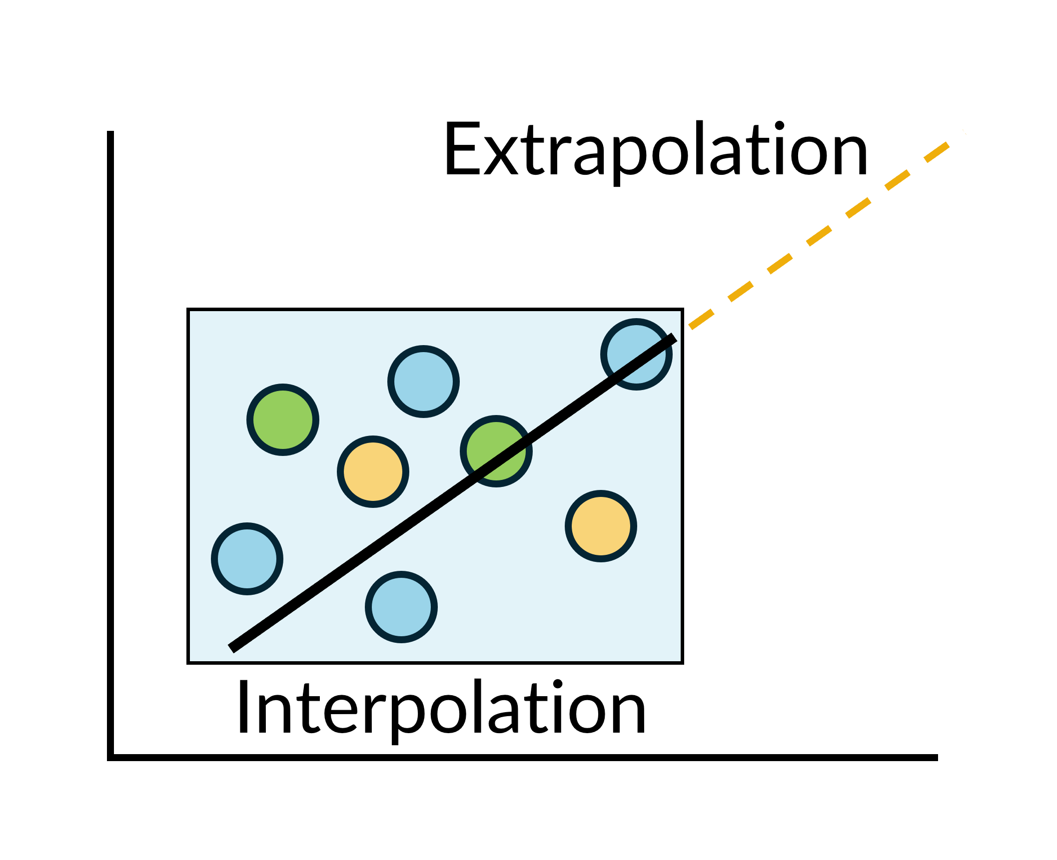 When we substitute a value that lies within the range of values of that variable in our known data, we call this an interpolation (inter = between). The strength of the relationship between the variables influences how confident we can be about the outcomes of this prediction.