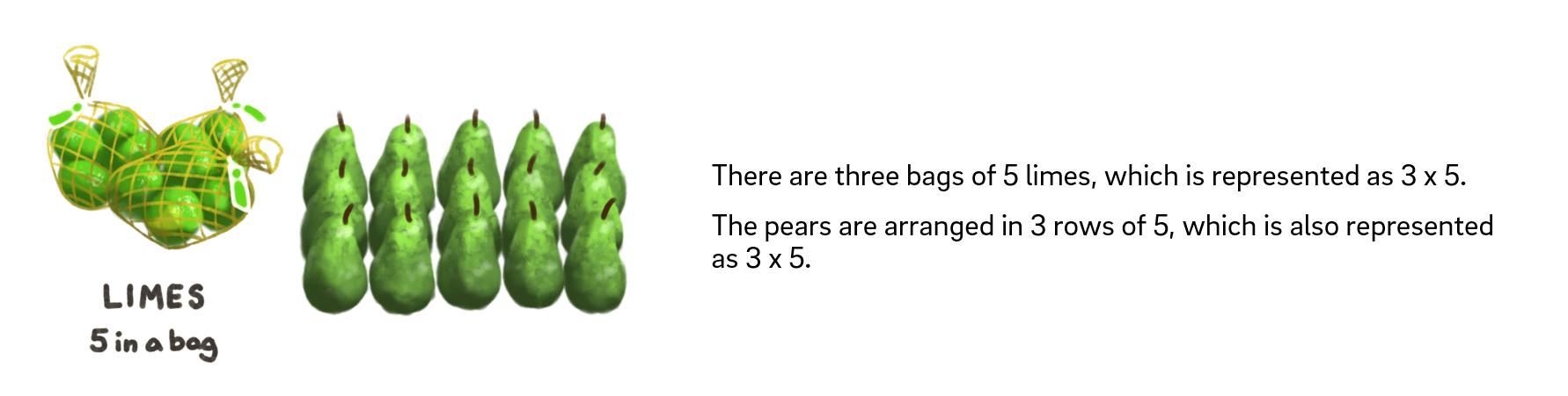 - The limes and pears are similar because they are both arranged into 3 groups with 5 in each group. They are different because the limes are in 3 bags of 5 and the pears are in 3 rows of 5.