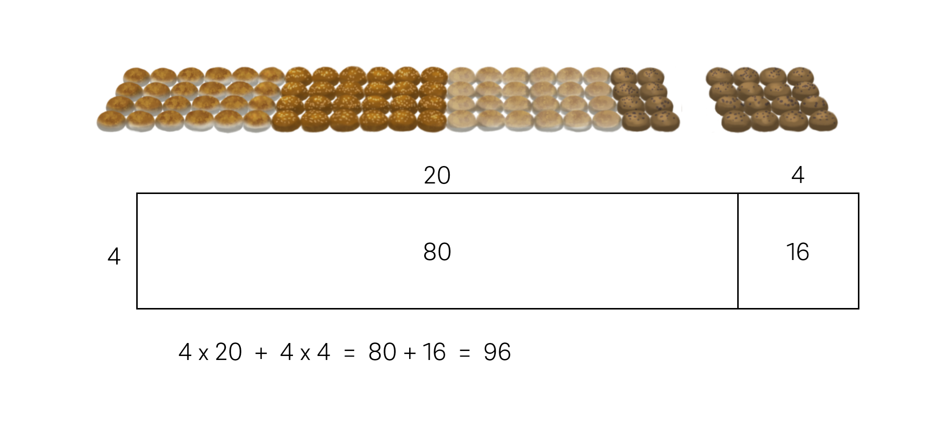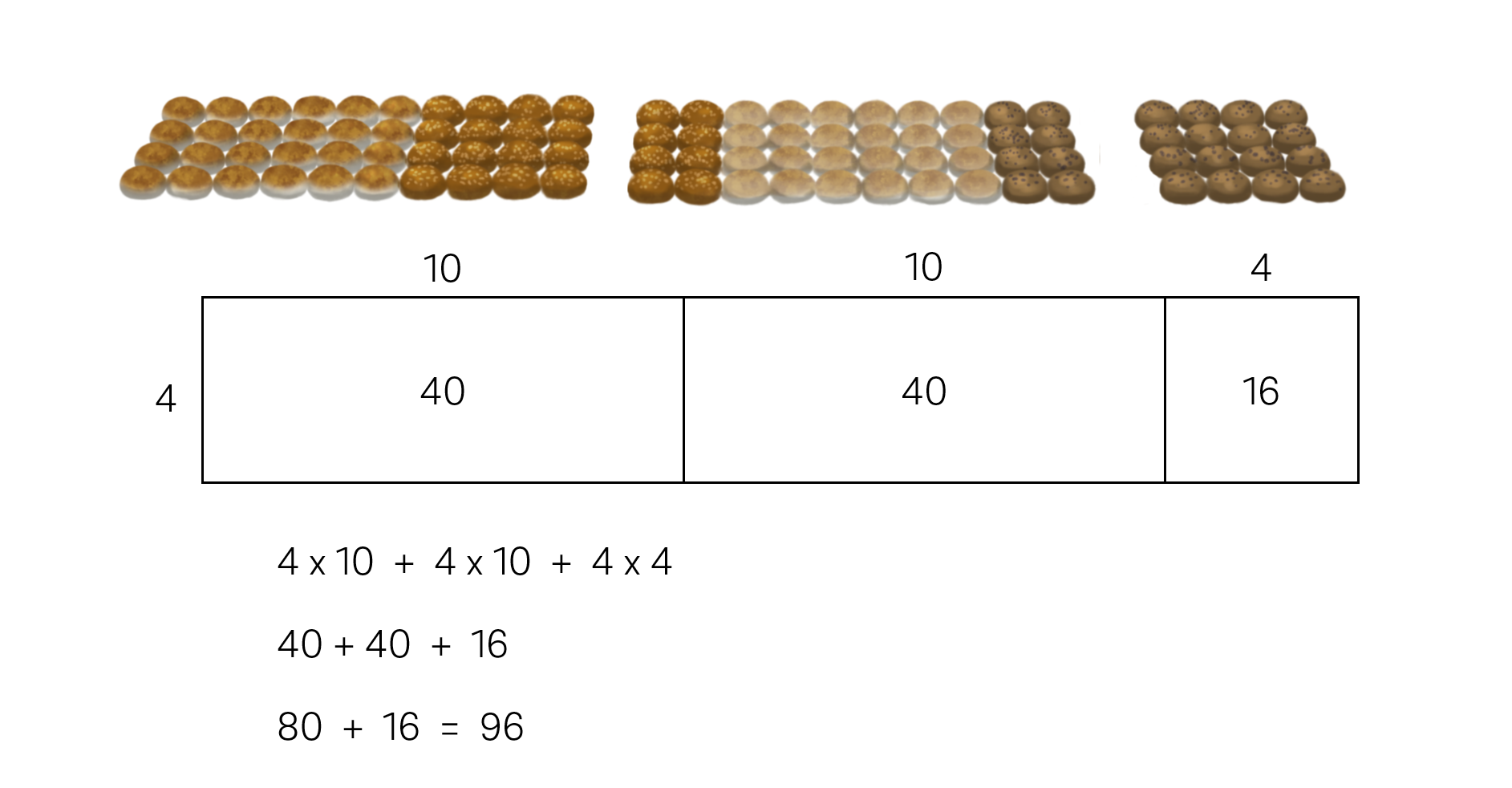 - Multiplication by whole tens is efficient and is also foundational to using the formal multiplication algorithm in later years. As the bread rolls are in smaller 4 x 6 arrays it is not immediately obvious that you can partition based on ten. Students should see that partitioning the array based on the place value parts of numbers is a helpful strategy.