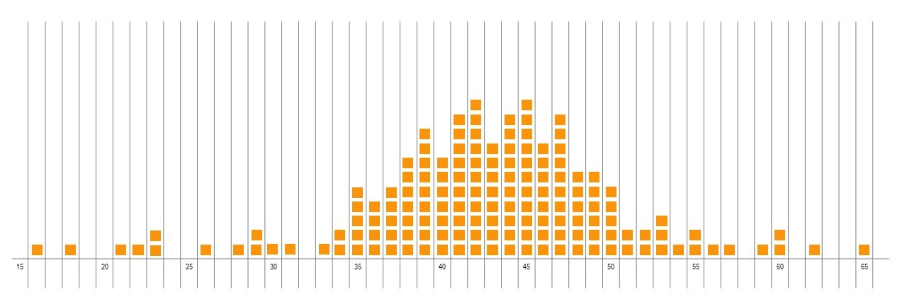 The crown of the hat is made up of a rectangle which shows the middle 50% of the data. The brim stretches out either side of this rectangle across the data. The brim takes up the remaining 50% of the data, with 25% of this data on either side of the crown. Drawing a hat plot over the dot data focuses student attention on the whole data set, rather than seeing it as separate data points. This helps to develop their understanding of data in terms of its pattern, shape and distribution. The centre of the data can be seen as a ‘clump’ of dots.