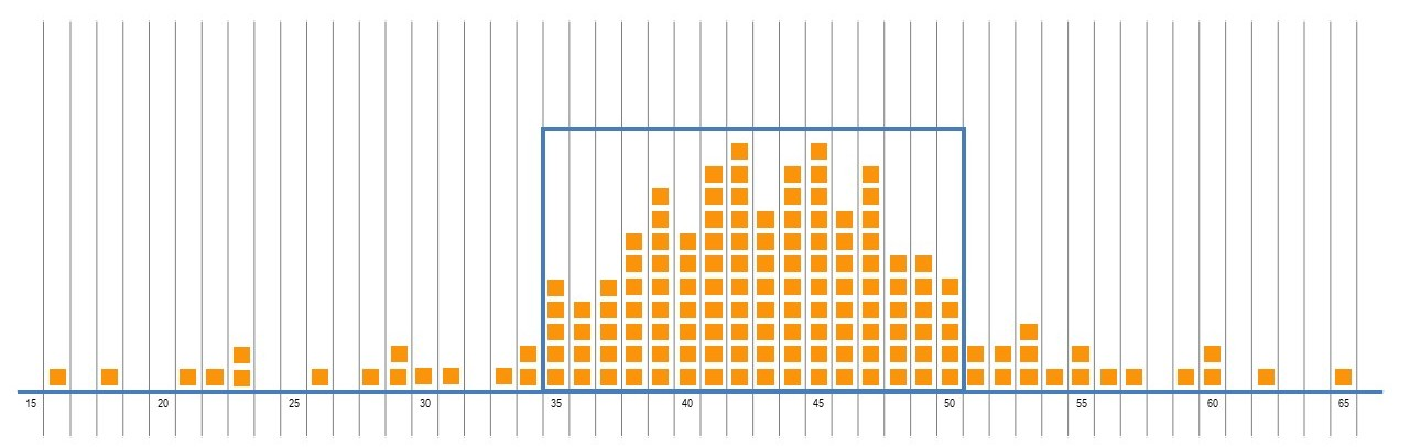 - Draw a rectangle around this centre clump. It should be approximately 50% of the data. This is the crown of the hat plot.