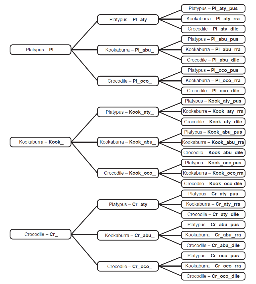 Discuss how the tree diagram clearly illustrates all possibilities and highlights the multiplicative structure of the problem. Note, however, that with ten animals the number of combinations becomes so large that a tree diagram is inefficient and impractical. Encourage students to look for relationships that can be generalised into more efficient strategies.