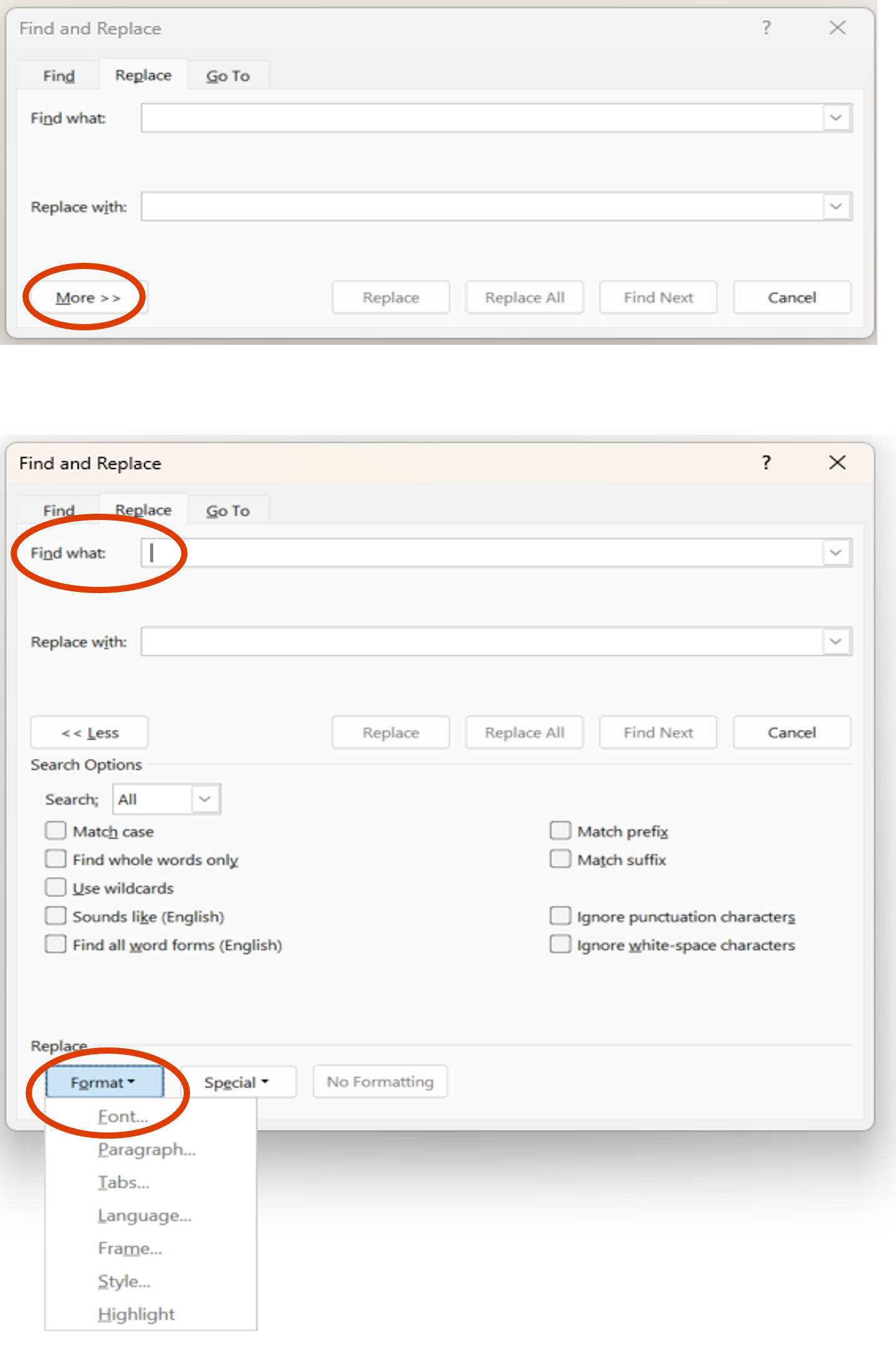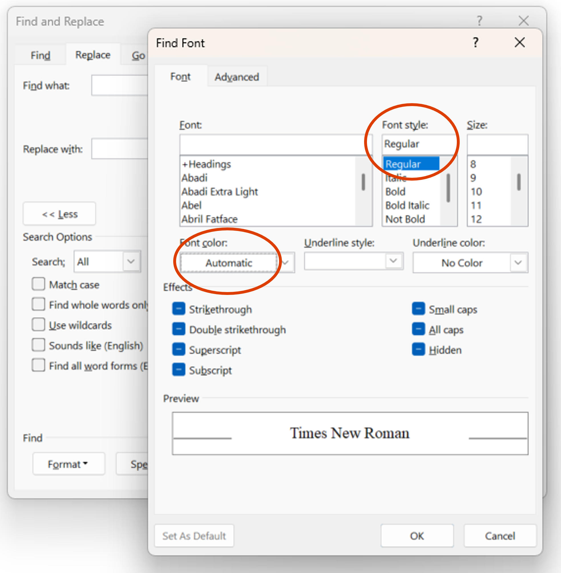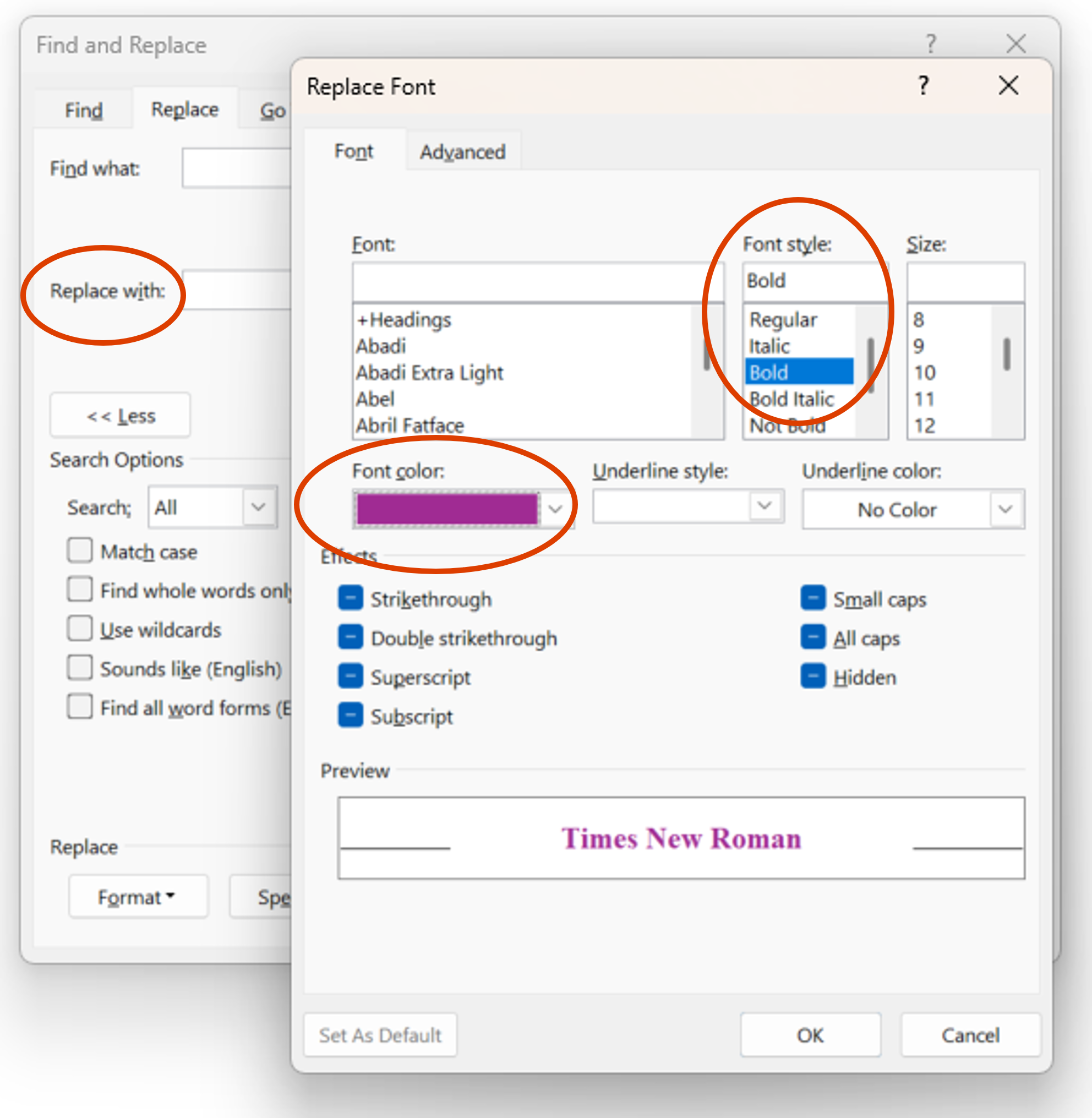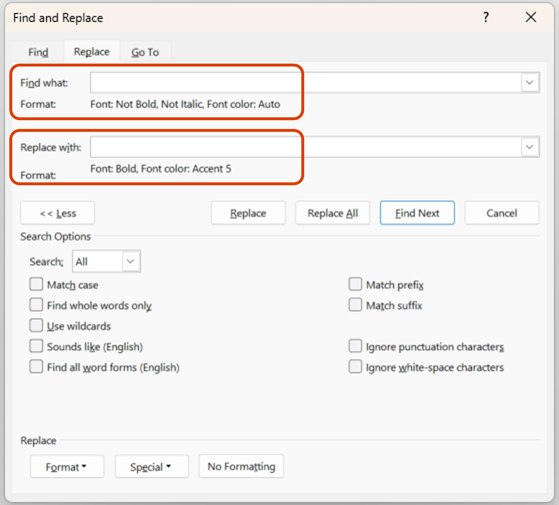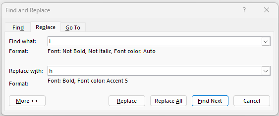 | You will see the format of the font now for the text that will be searched and the replacement text. | ![]() |