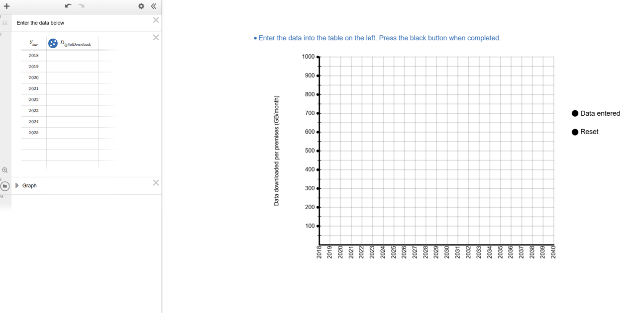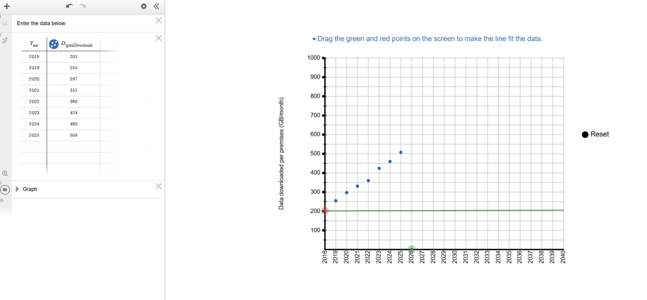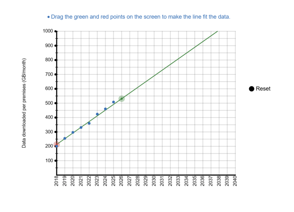An example prediction students could make in 2027 could be: in 2037, we predict that the average digital downloads per premises per month will have grown to over 900 GB, more than double the amount in 2023 (the end of the provided data). Therefore CO2 emissions caused by digital downloads would increase to double the amount, from 424×0.05=21.2 kg (where 1GB produces 50g of CO2) to around 900×0.05=45 kg.