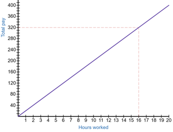 An example is the number of hours that a person works in an hourly-wage based job and the amount of pay they receive. If a person earns $20 per hour and works for 16 hours in a week, they will earn 16×$20=$320. An increase in hours would mean an equivalent increase in pay. If we let the number of hours worked equal H and the amount of pay equal P, then this situation follows the linear model P=20H, shown in the graph below.