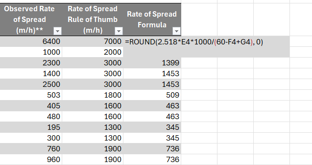Ask students to write a formula based on this equation in the appropriate spreadsheet column to calculate the rate of fire spread. Then, have them compare the results produced by their formula with those obtained using the rule of thumb and the actual observed rates of spread.